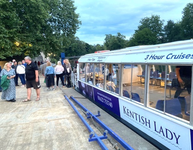 The weather was kind and the river peaceful, with only a fascinating linger at East Farleigh lock briefly interrupting gentle progress on a still evening. Boat owner Nick Kennedy, boat owner/captain, gave an interesting commentary on the historic and other sights passed along the way. However, there was no official mention of the naked man spotted by some baring all on the towpath! A varied buffet supper and bar, with free hot drinks, added to the evening’s pleasure.